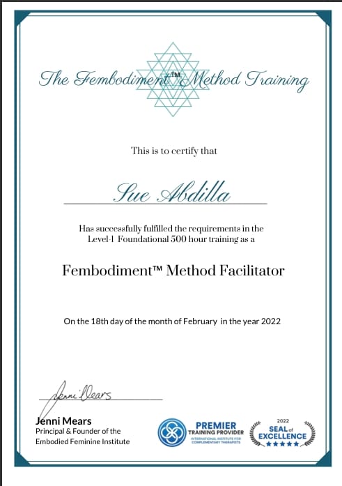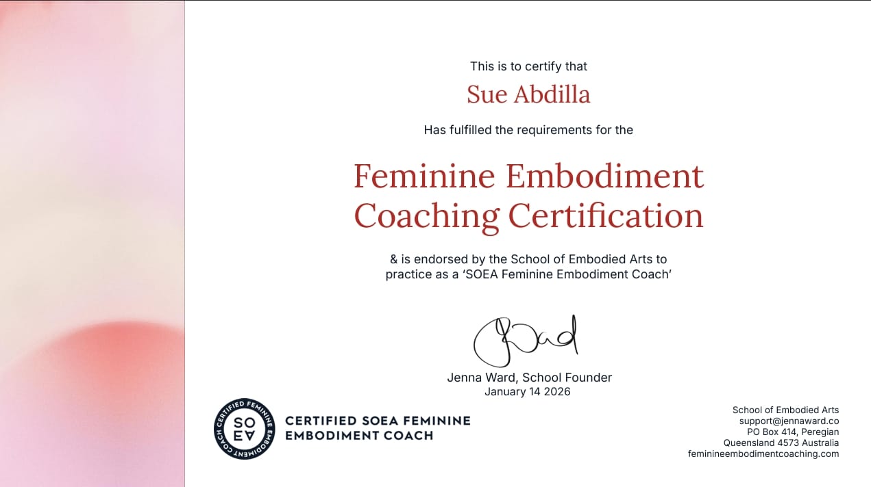 My coaching draws from my Warrior Embodied Coaching training together with accredited certifications with The Feminine Embodiment Coaching Certification with the School of Embodied Arts and The Fembodiment™ Method.